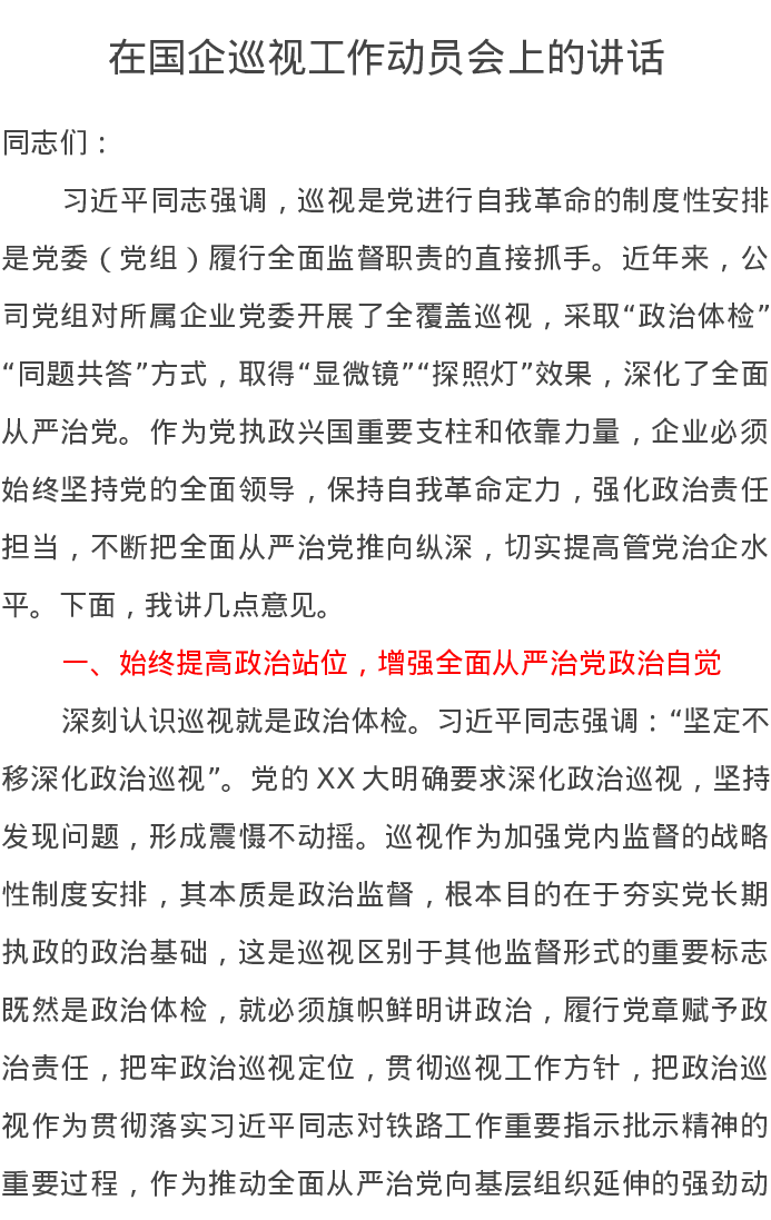 在国企巡视工作动员会上的讲话
