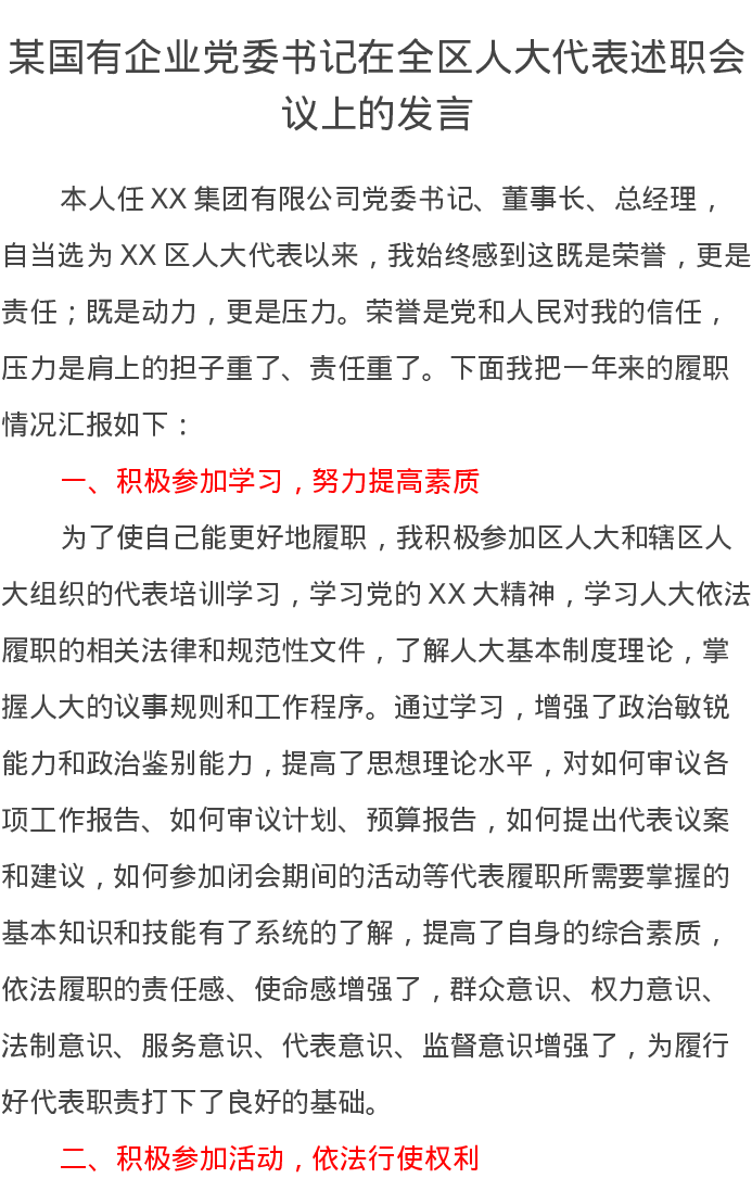 某国有企业党委书记在全区人大代表述职会议上的发言