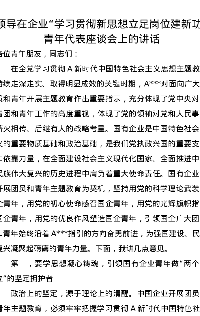领导在企业“学习贯彻新思想立足岗位建新功”青年代表座谈会上的讲话