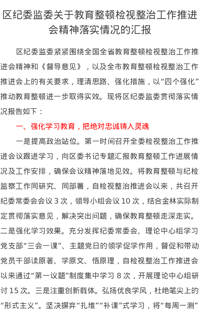 区纪委监委关于教育整顿检视整治工作推进会精神落实情况的汇报