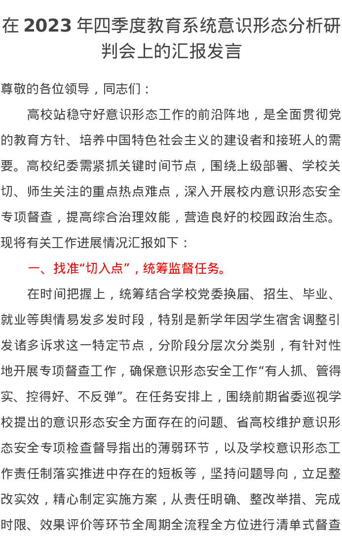 在2023年四季度教育系统意识形态分析研判会上的汇报发言