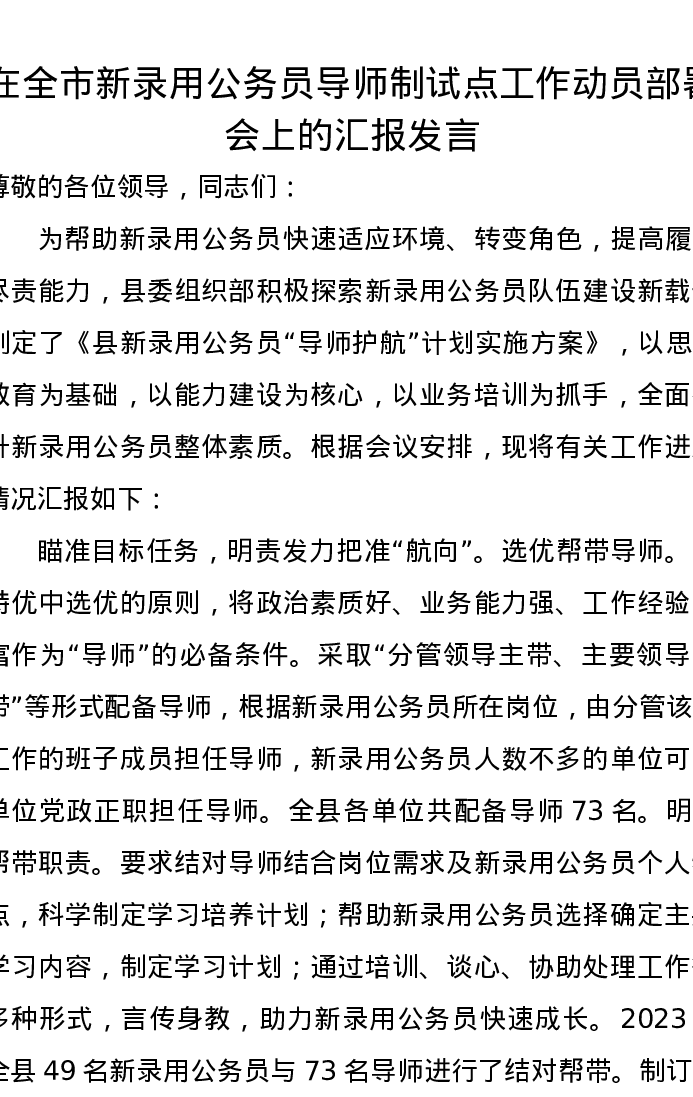 在全市新录用公务员导师制试点工作动员部署会上的汇报发言