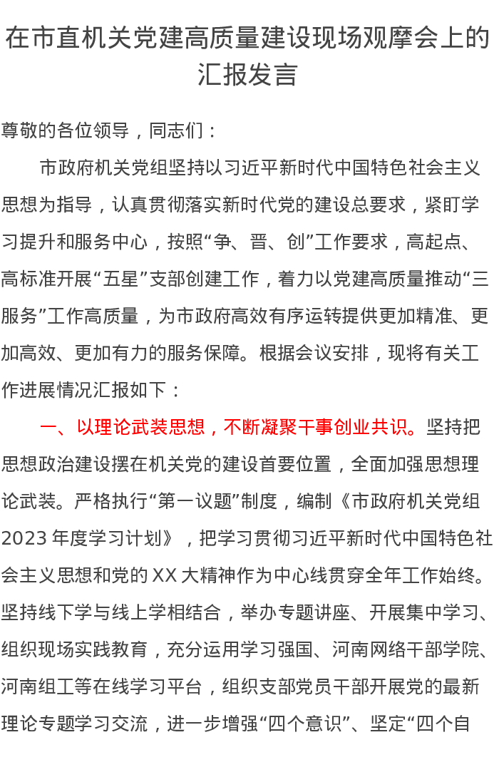 在市直机关党建高质量建设现场观摩会上的汇报发言