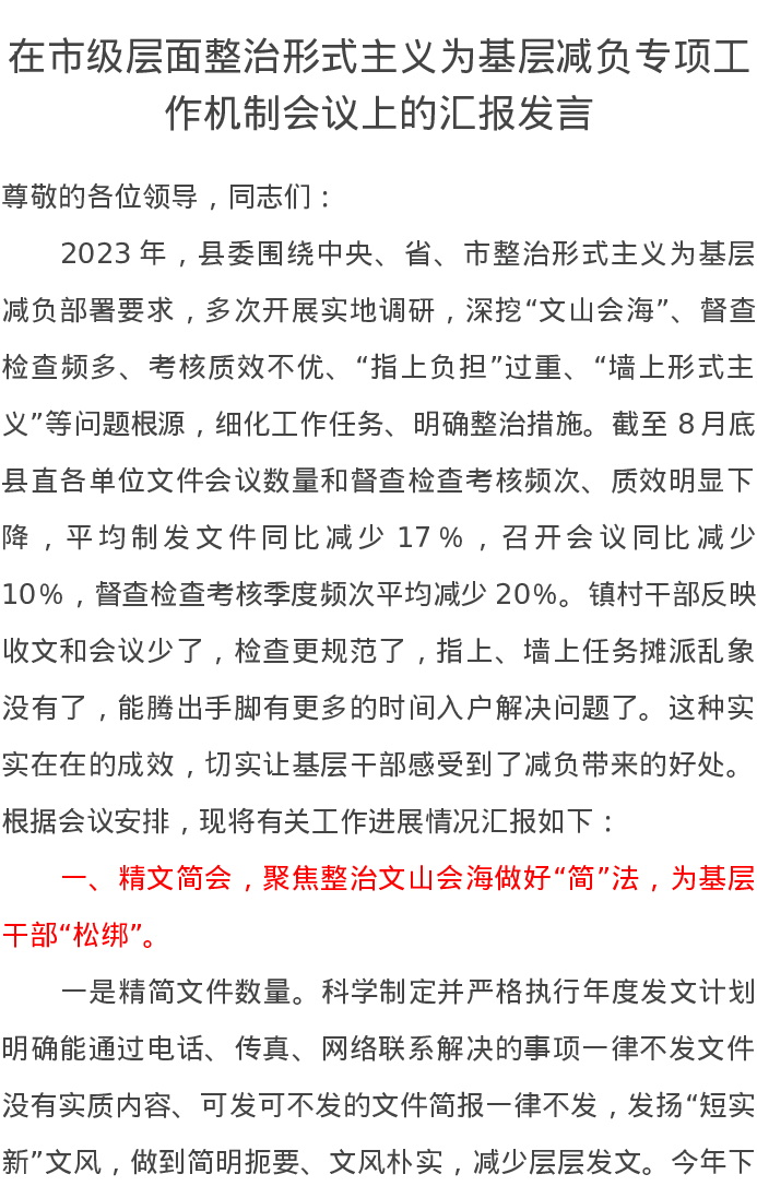 在市级层面整治形式主义为基层减负专项工作机制会议上的汇报发言