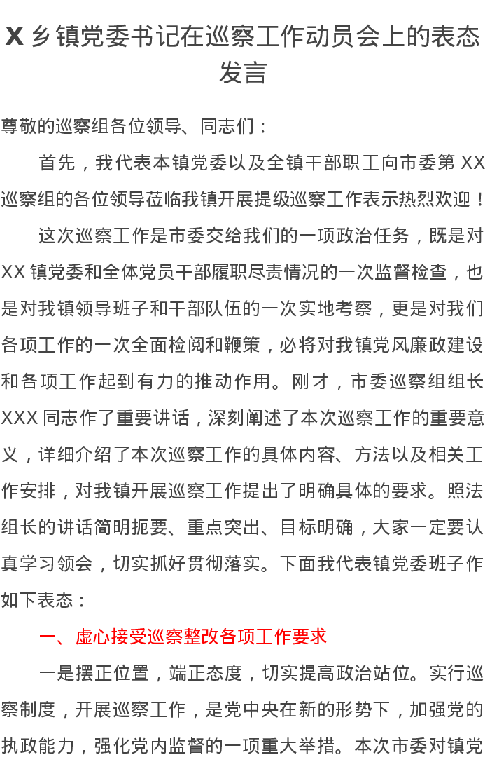 X乡镇党委书记在巡察工作动员会上的表态发言