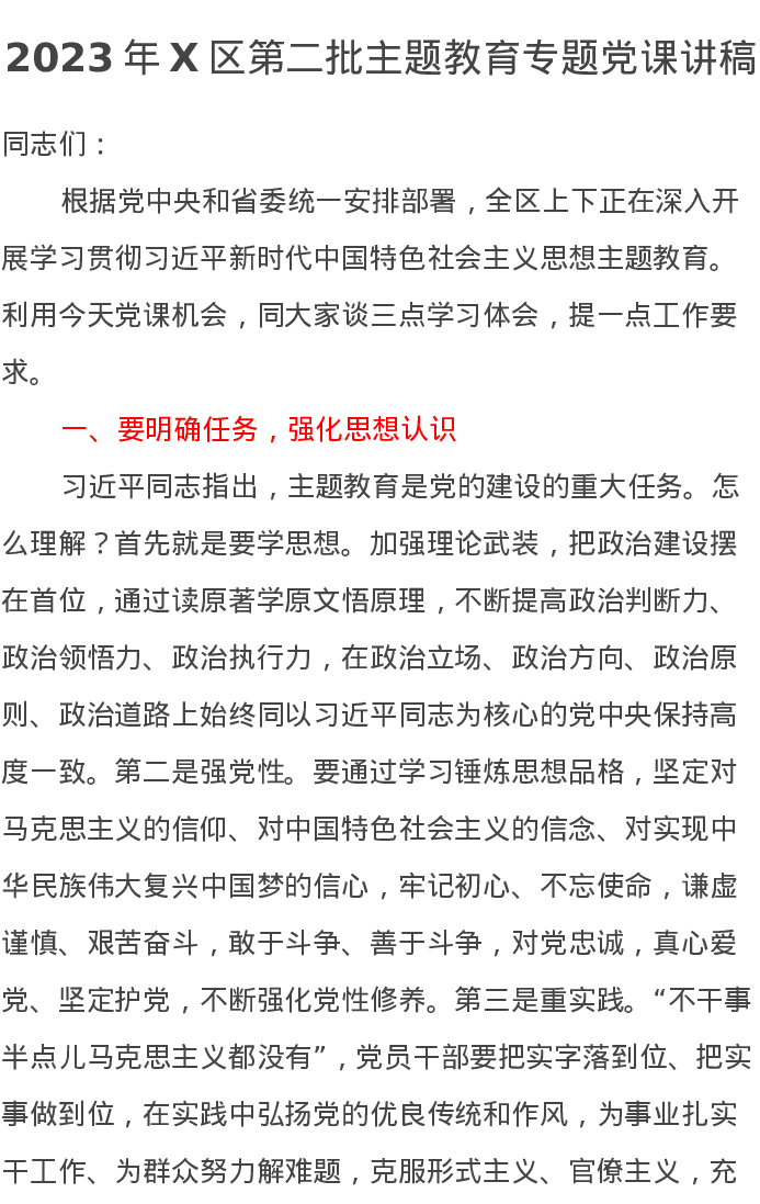 2023年X区第二批主题教育专题党课讲稿(特色社会主义思想)