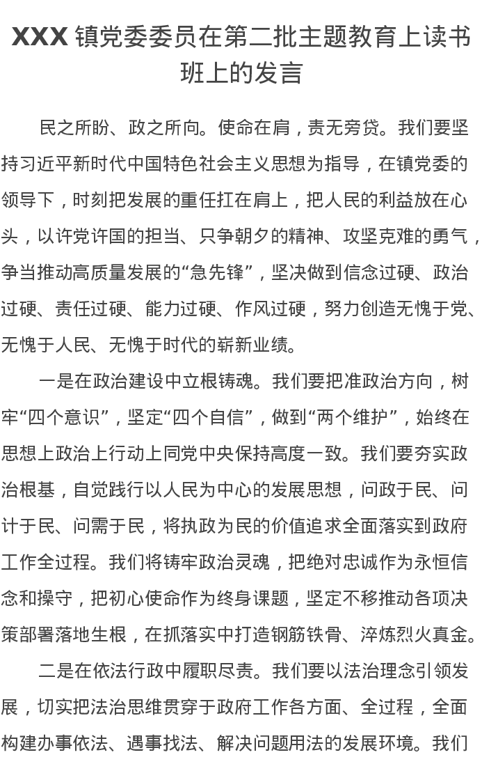 XXX镇党委委员在第二批主题教育上读书班上的发言(特色社会主义思想)