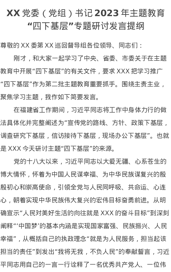 XX党委(党组)书记2023年第二批主题教育“四下基层”专题研讨发言提纲(特色社会主义思想)
