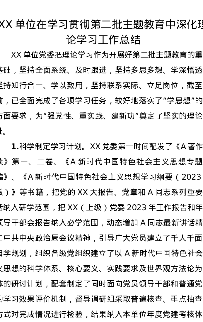XX单位在学习贯彻第二批主题教育中深化理论学习工作总结(特色社会主义思想)