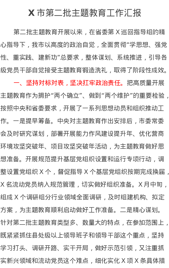 X市第二批主题教育工作汇报(特色社会主义思想)