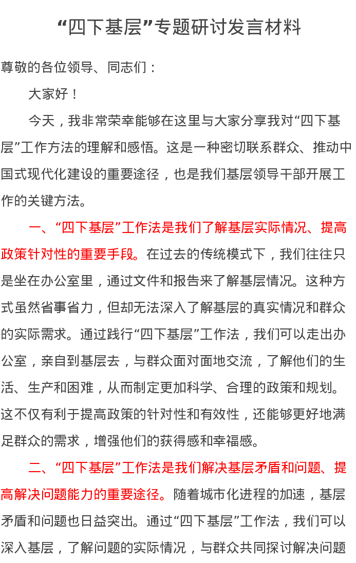 “四下基层”专题研讨发言材料(特色社会主义思想主题教育)