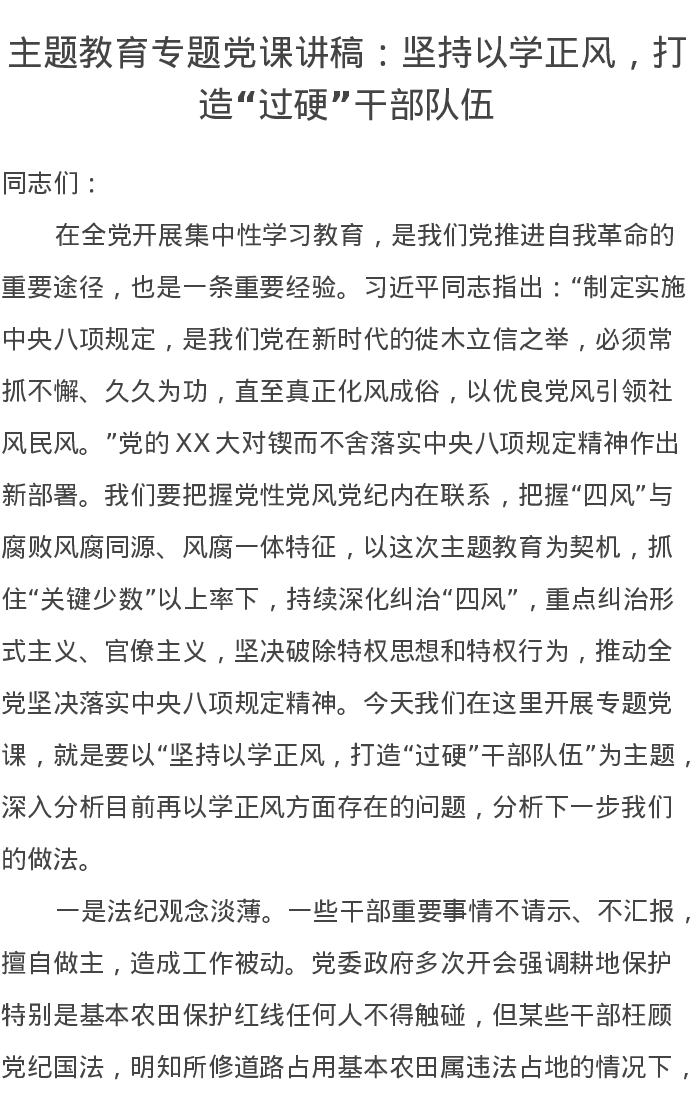 主题教育专题党课讲稿:坚持以学正风,打造“过硬”干部队伍(特色社会主义思想)