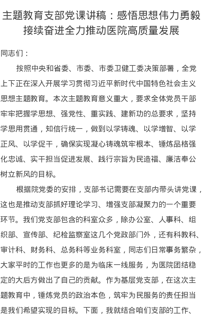 主题教育支部党课讲稿:感悟思想伟力勇毅接续奋进全力推动医院高质量发展(特色社会主义思想)