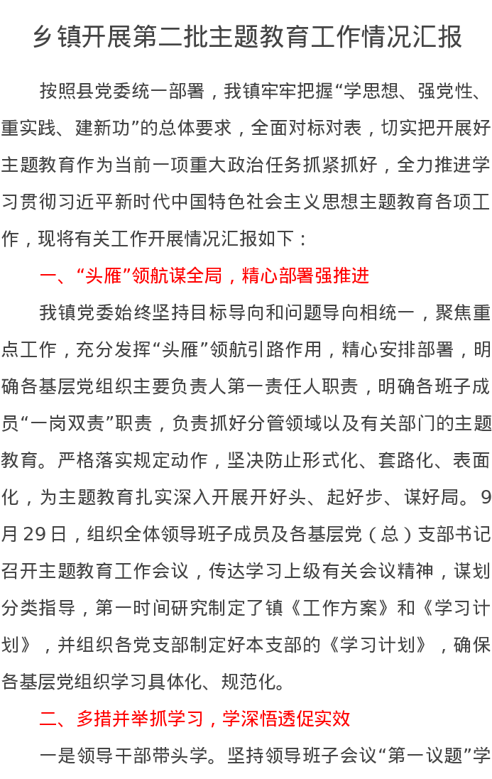 乡镇开展第二批主题教育工作情况汇报(特色社会主义思想)