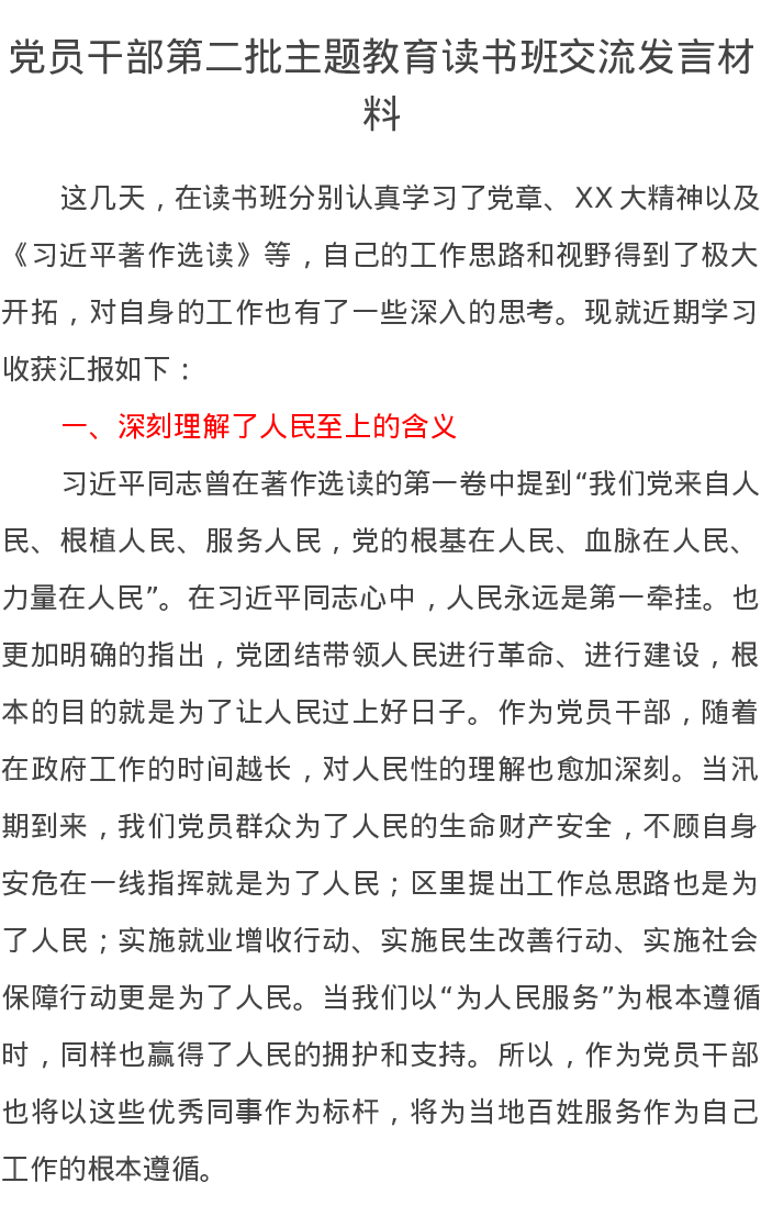 党员干部第二批主题教育读书班交流发言材料(特色社会主义思想)