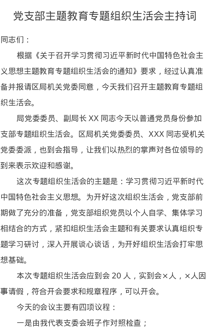 党支部主题教育专题组织生活会主持词(特色社会主义思想)