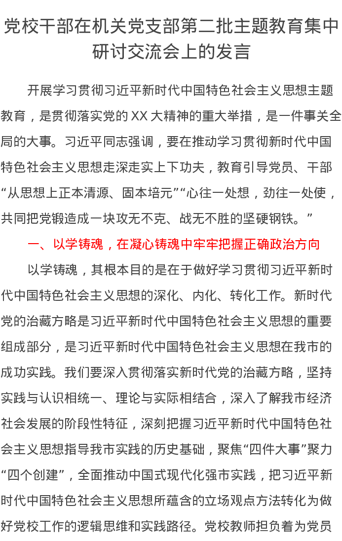 党校干部在机关党支部第二批主题教育集中研讨交流会上的发言(特色社会主义思想)