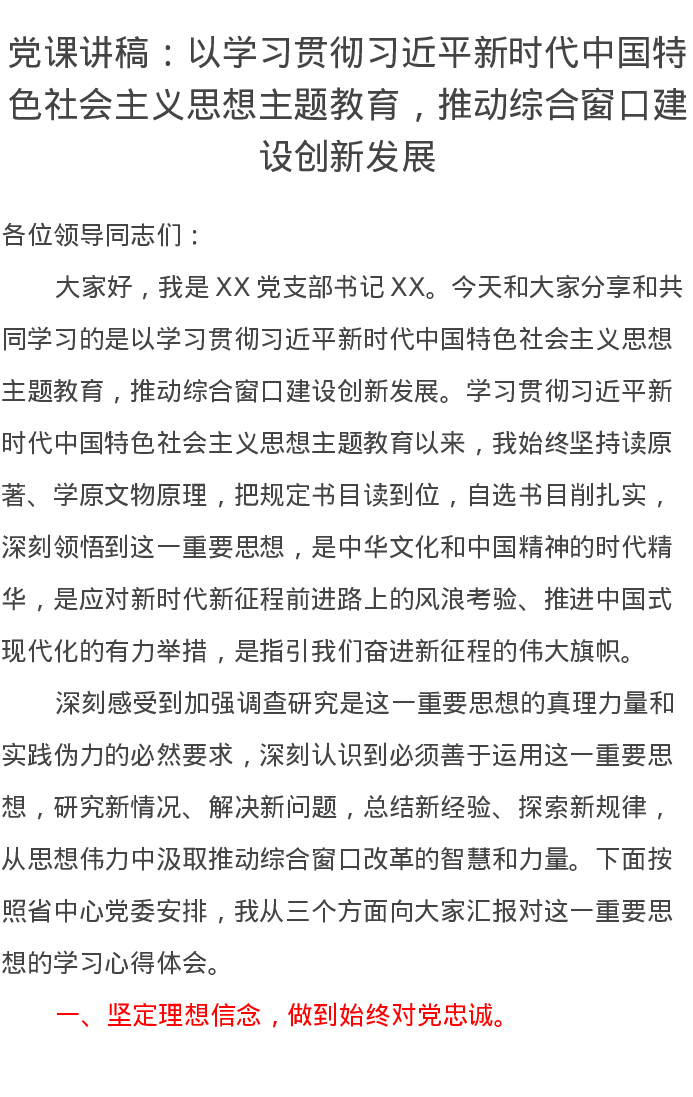 党课讲稿:以学习贯彻习近平新时代中国特色社会主义思想主题教育,推动综合窗口建设创新发展(特色社会主义思想)