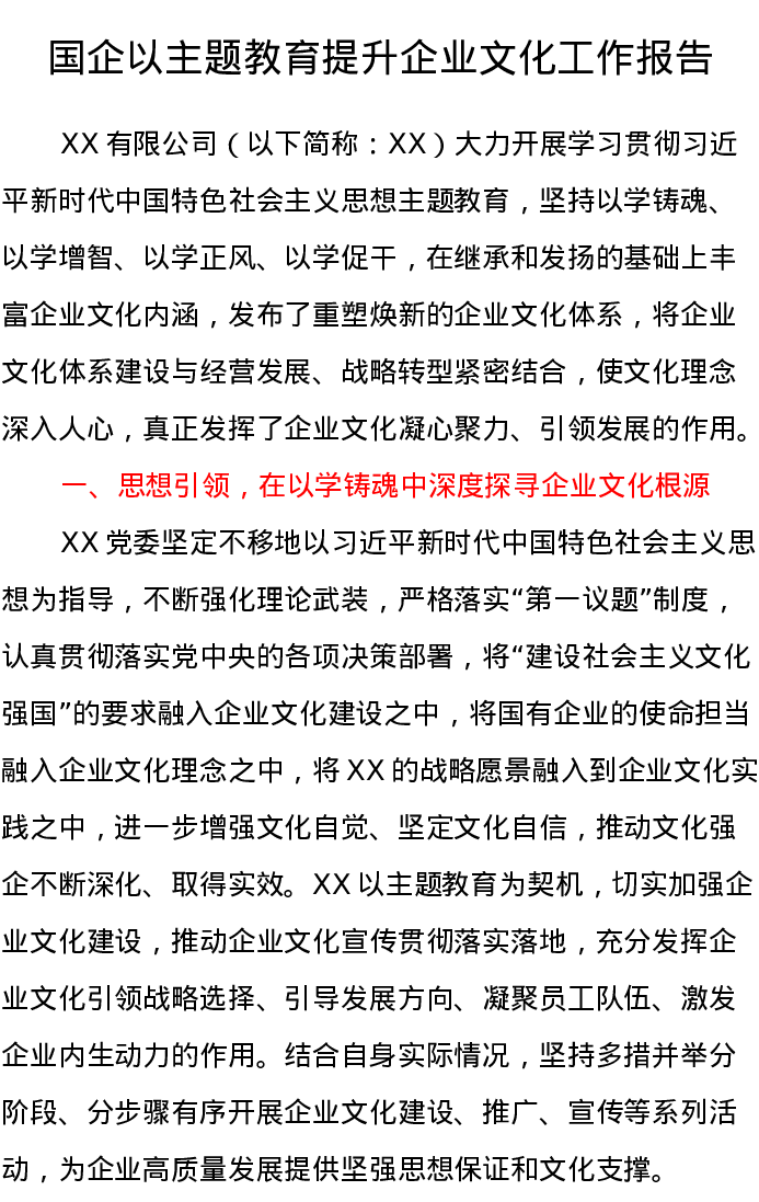 国企以主题教育提升企业文化工作报告(特色社会主义思想)