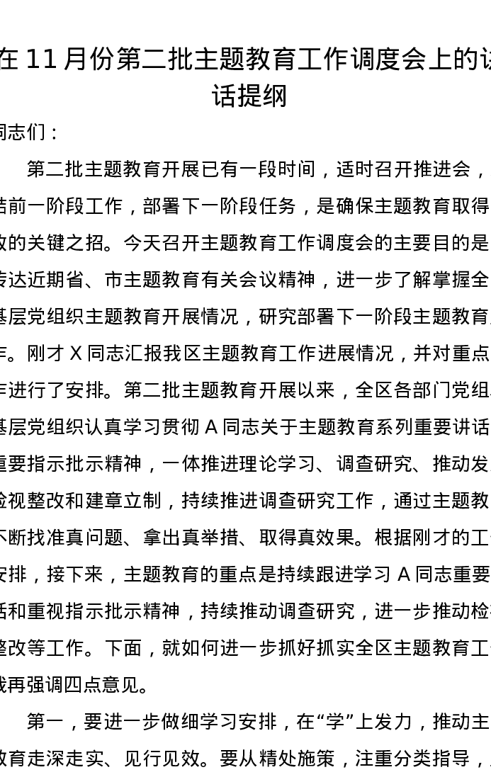 在11月份第二批主题教育工作调度会上的讲话提纲(特色社会主义思想)