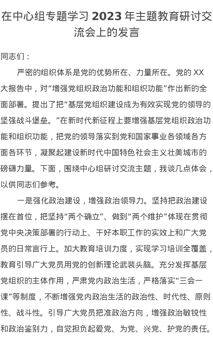 在中心组专题学习2023年第二批主题教育研讨交流会上的发言(特色社会主义思想)