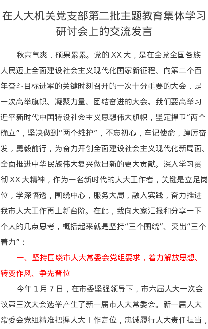 在人大机关党支部第二批主题教育集体学习研讨会上的交流发言