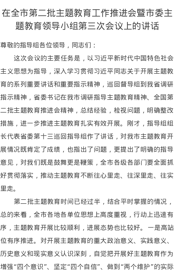 在全市第二批主题教育工作推进会暨市委主题教育领导小组第三次会议上的讲话(特色社会主义思想)