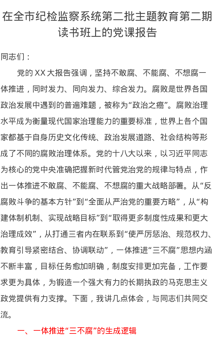 在全市纪检监察系统第二批主题教育第二期读书班上的党课报告(特色社会主义思想)