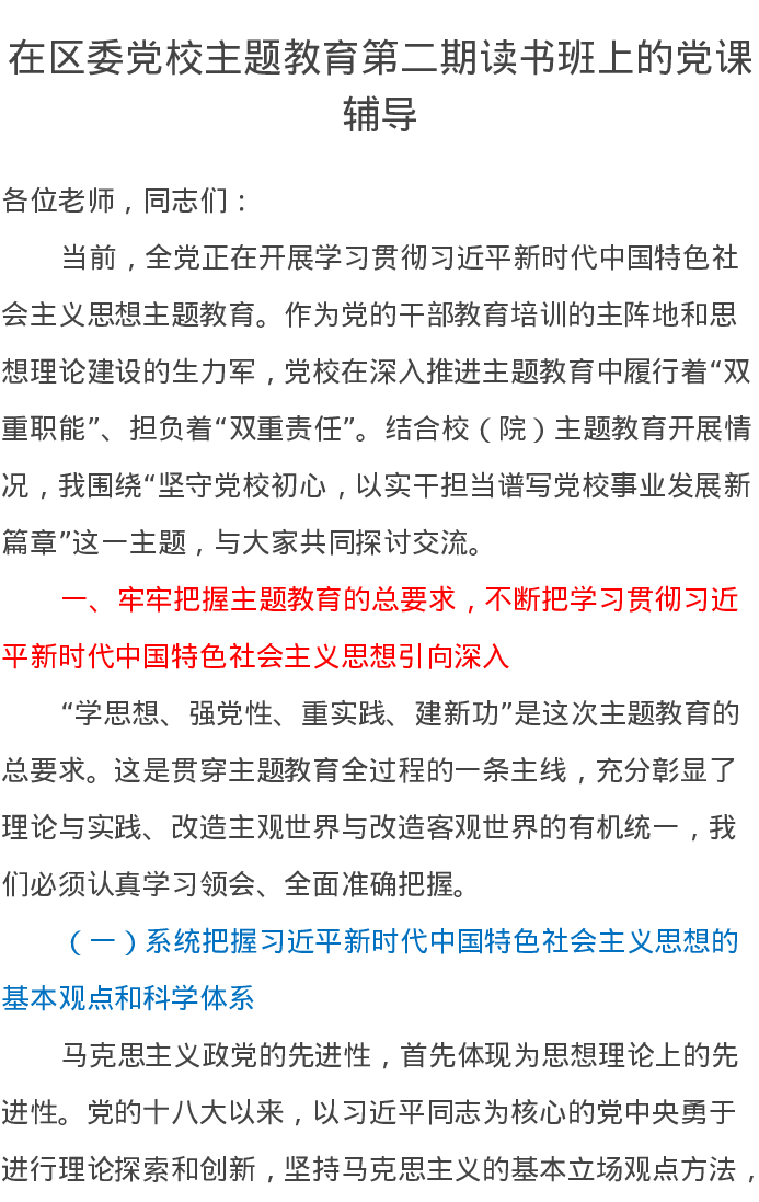 在区委党校第二批主题教育第二期读书班上的党课辅导(特色社会主义思想)