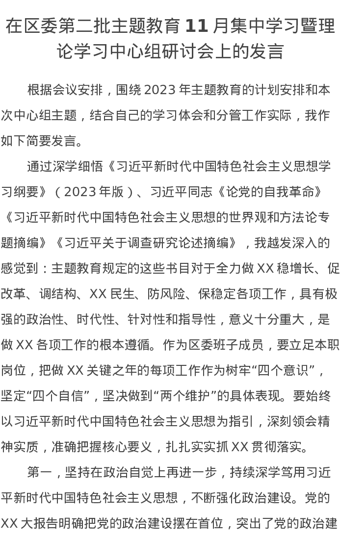 在区委第二批主题教育11月集中学习暨理论学习中心组研讨会上的发言(特色社会主义思想)