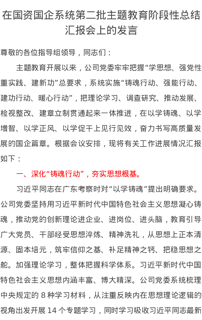 在国资国企系统第二批主题教育阶段性总结汇报会上的发言(特色社会主义思想)