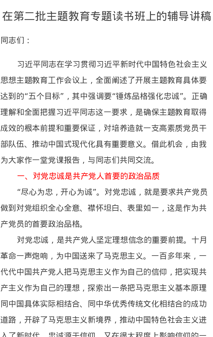 在第二批主题教育专题读书班上的辅导讲稿(特色社会主义思想)