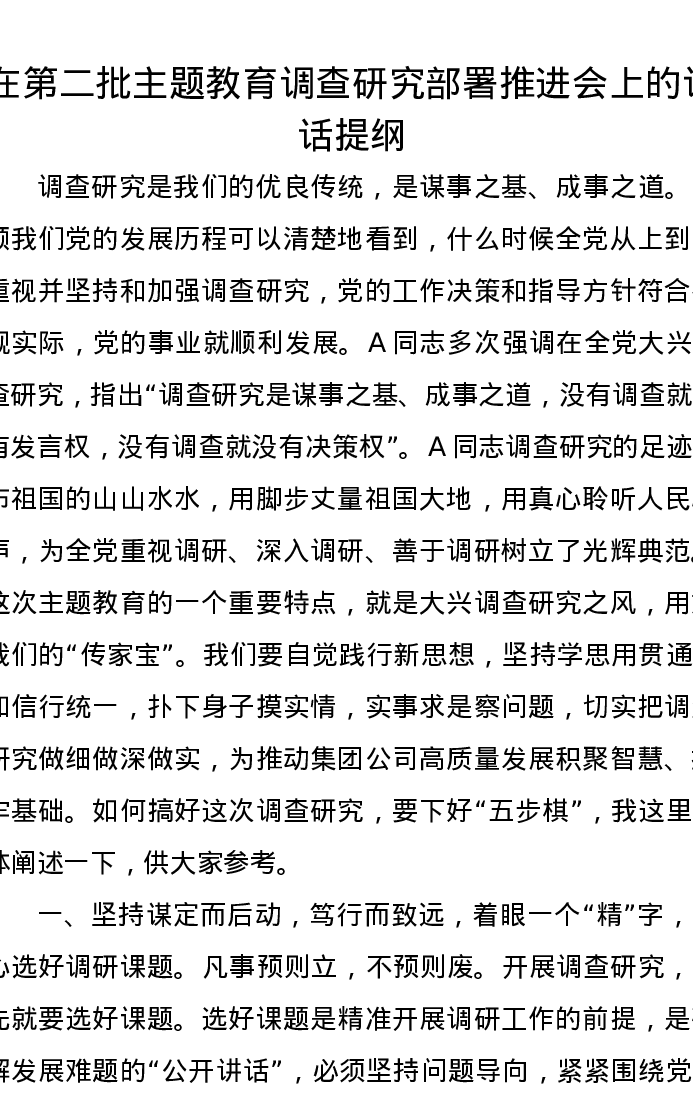 在第二批主题教育调查研究部署推进会上的讲话提纲(特色社会主义思想)
