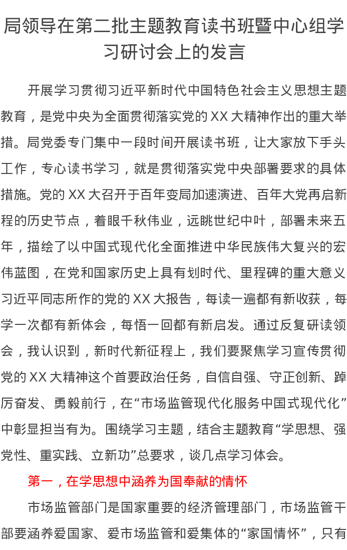 局领导在第二批主题教育读书班暨中心组学习研讨会上的发言(特色社会主义思想)