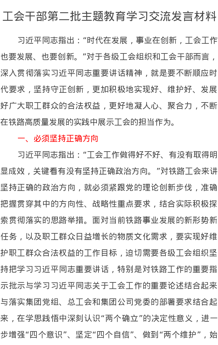 工会干部第二批主题教育学习交流发言材料(特色社会主义思想)