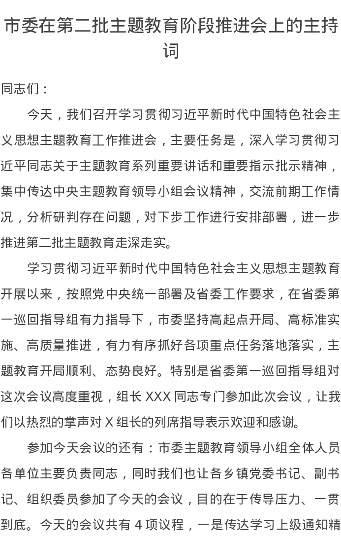 市委在第二批主题教育阶段推进会上的主持词(特色社会主义思想)