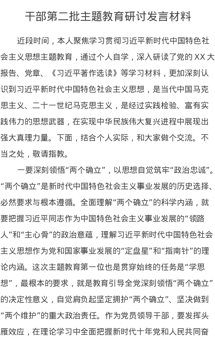 干部第二批主题教育研讨发言材料(特色社会主义思想)