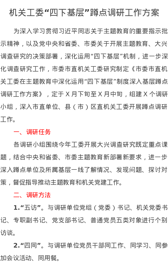 机关工委“四下基层”蹲点调研工作方案(特色社会主义思想主题教育)