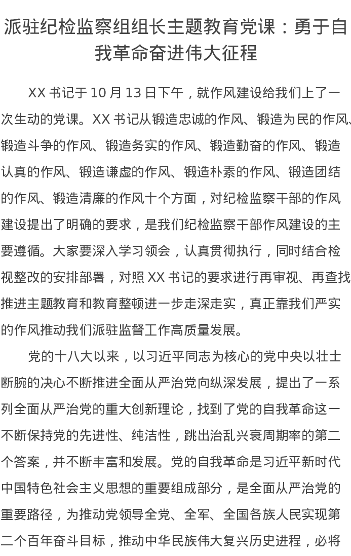 派驻纪检监察组组长主题教育党课讲稿:勇于自我革命奋进伟大征程(特色社会主义思想)