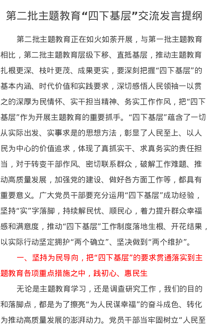 第二批主题教育“四下基层”交流发言提纲(特色社会主义思想)