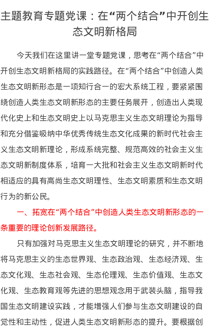 第二批主题教育专题党课讲稿:在“两个结合”中开创生态文明新格局(特色社会主义思想)