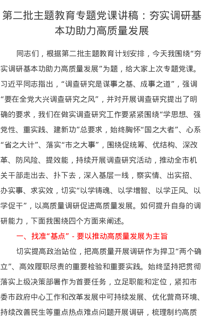 第二批主题教育专题党课讲稿:夯实调研基本功助力高质量发展(特色社会主义思想)