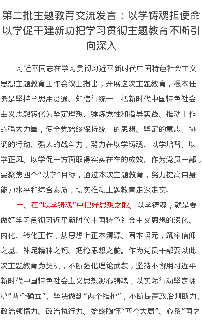 第二批主题教育交流发言:以学铸魂担使命以学促干建新功把学习贯彻主题教育不断引向深入(特色社会主义思想)