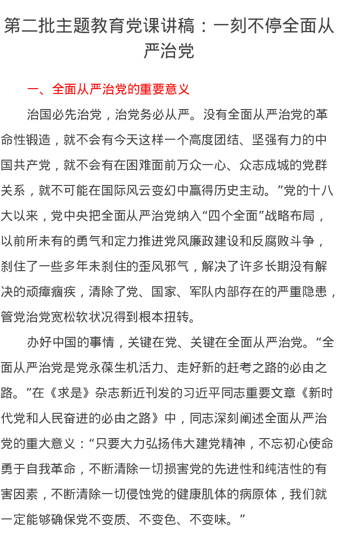 第二批主题教育党课讲稿:一刻不停全面从严治党(特色社会主义思想)