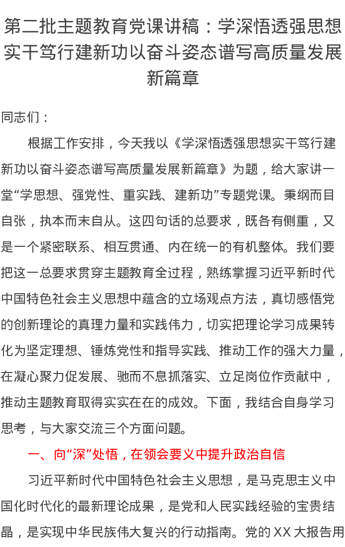 第二批主题教育党课讲稿:学深悟透强思想实干笃行建新功以奋斗姿态谱写高质量发展新篇章(特色社会主义思想)