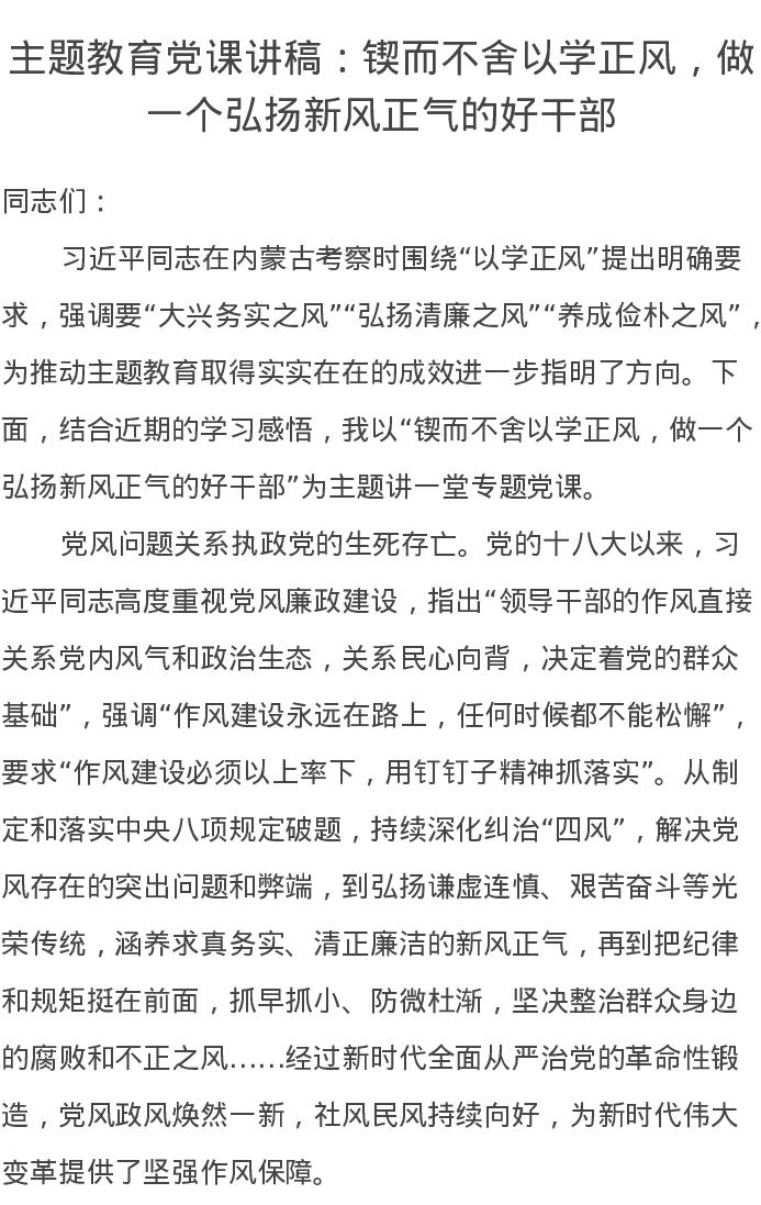 第二批主题教育党课讲稿:锲而不舍以学正风,做一个弘扬新风正气的好干部