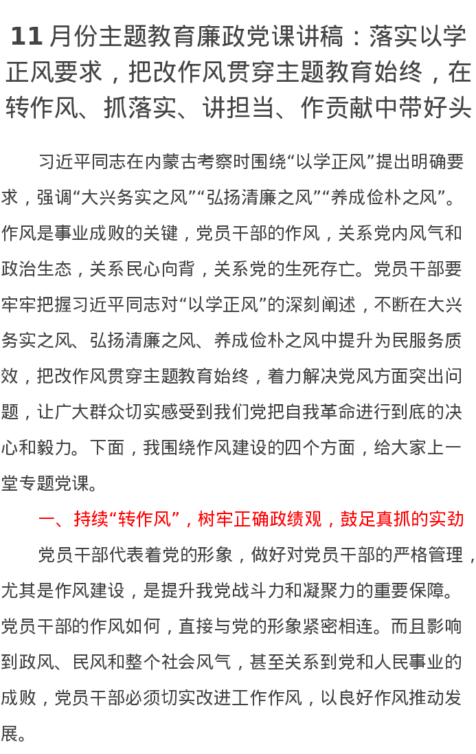 11月份主题教育廉政党课讲稿:落实以学正风要求,把改作风贯穿主题教育始终,在转作风、抓落实、讲担当、作贡献中带好头(特色社会主义思想)