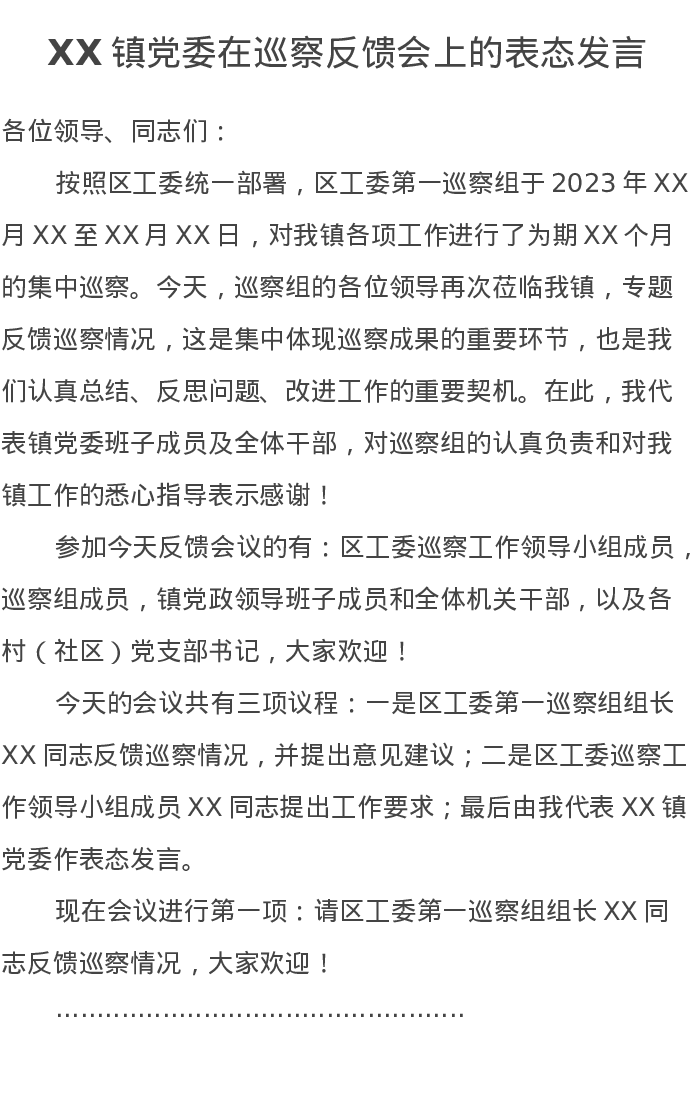 XX镇党委在巡察反馈会上的表态发言