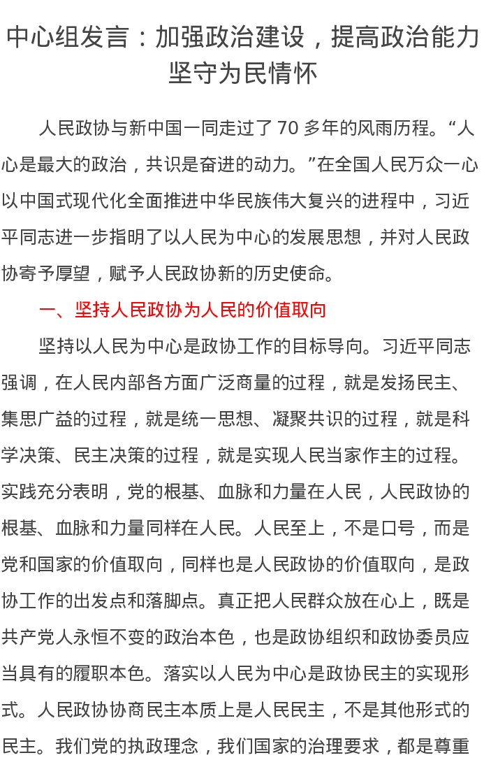 中心组发言:加强政治建设,提高政治能力,坚守为民情怀