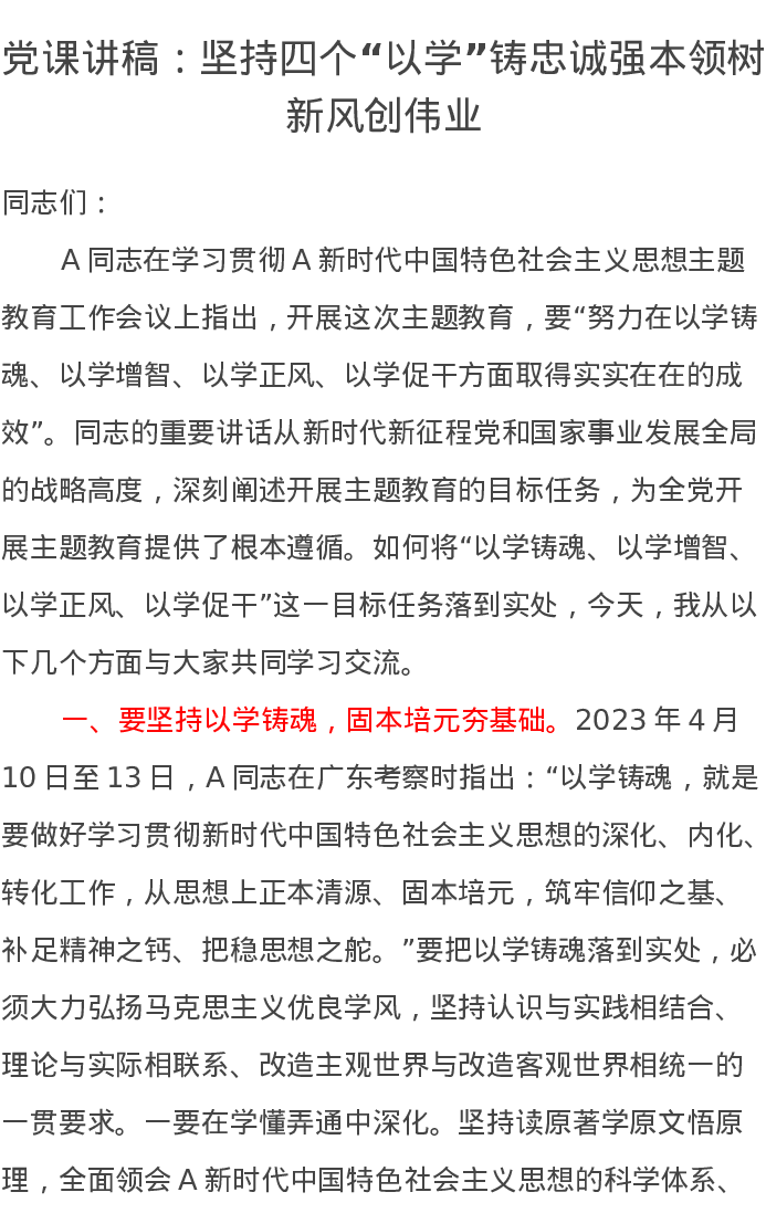 党课讲稿:坚持四个“以学”铸忠诚强本领树新风创伟业